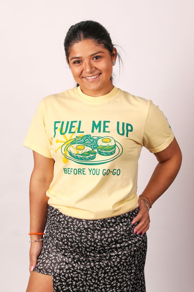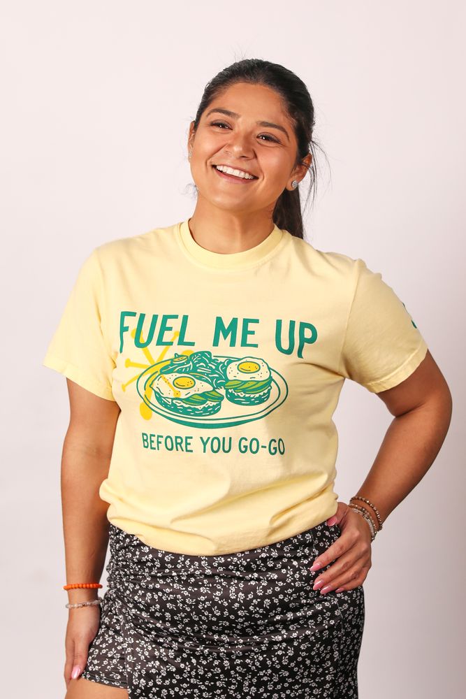 A sturdy heavyweight tee built for all-day wear. The “Fuel Me Up” graphic on the front brings a hit of playful brunch humor to a classic silhouette.